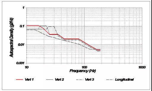 SAE J2380標(biāo)準(zhǔn)振動目標(biāo)譜基于實際道路測量數(shù)據(jù),旨在模擬行駛10萬英里對電池組和模塊的影響。該標(biāo)準(zhǔn)要求一系列隨機(jī)振動目標(biāo)譜應(yīng)用于三個垂直軸,試驗時長從9分鐘到38小時不等。